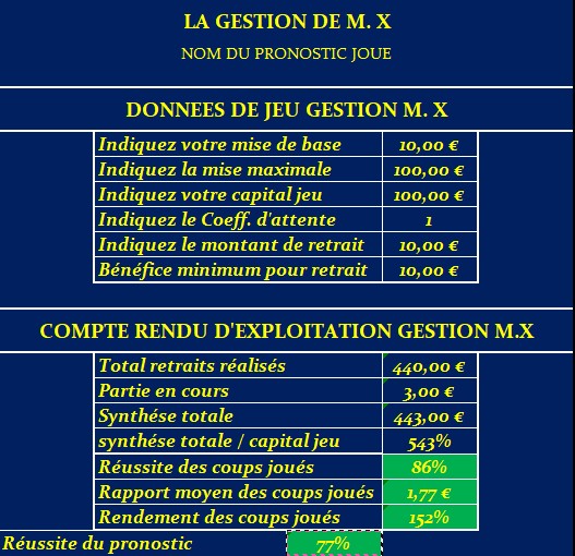 excellent. T.G. Bayel. - La Gestion de Mr.X version 2 est vraiment très professionnelle et très bien adaptée à vos pronostics en évitant surtout l'emballement des mises. Avec cette gestion, on sait que le capital ne sera pas perdu. Félicitations. J.P.F. Roanne. - Je commence à m'imprégner de la