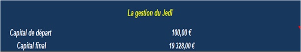 La gestion du Jedï Nous avons eu l’idée avec M. ROUSSET de travailler sur un « Pack de Noel ». Après avoir échangé, nous avons regardé la panoplie des produits existants à aujourd’hui et avons eu l’idée de vous proposer 3 anciennes gestions certainement oubliées par la plupart d’entre vous mais qui pourtant, vous le verrez, continuent d’être très efficaces et surtout complètement sécurisées. Les tests ont été effectués sur le Cheval des Editions Magic Prono car c’est un cheval qui existe depuis les années 2000 et qui comporte une importante permanence de coups joués. Les tests ont aussi été effectués sur le Coup presque sûr des Editions Magic prono, un cheval donné sur tous les sites des Editions Magic prono. Et aussi sur le Coup sûr de tous les pronostics sur le site www.editions-magic-prono.eu, un super pronostic où il y a un grand nombre d’abonnés. Ceci dit, nous vous laissons le soin de tester avec l’ensemble des chevaux donnés par M. ROUSSET, car cela fonctionne aussi. L’application de ces gestions reste très simple, tout est indiqué dans la notice. LA GESTION DU JEDI