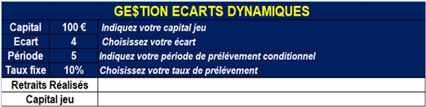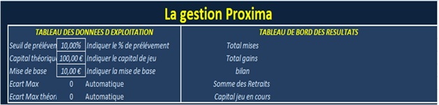Est venu par la suite d’autres idées plus sophistiquées comme rajouter la possibilité de réaliser des retraits, définitivement acquis et enlevés du résultat d’exploitation. Dans la gestion écarts dynamiques, vous pouvez choisir votre écart. Un grand plus pour les pronostics ayant des écarts plus importants. Les bénéfices pour la plupart astronomiques laissent rêveurs et sont dus au puissant algorithme de la gestion mais aussi et surtout à la rentabilité et la stabilité incroyable des 3 pronostics cités dans cette page, de M. Rousset ne l’oublions pas. Prenez vos bénéfices régulièrement, fixez vous une limite et recommencez une nouvelle gestion. N’attendez pas que les mises soient trop élevées. LA GESTION PROXIMA